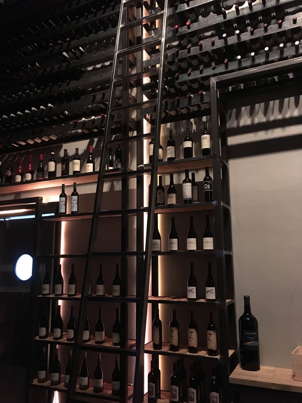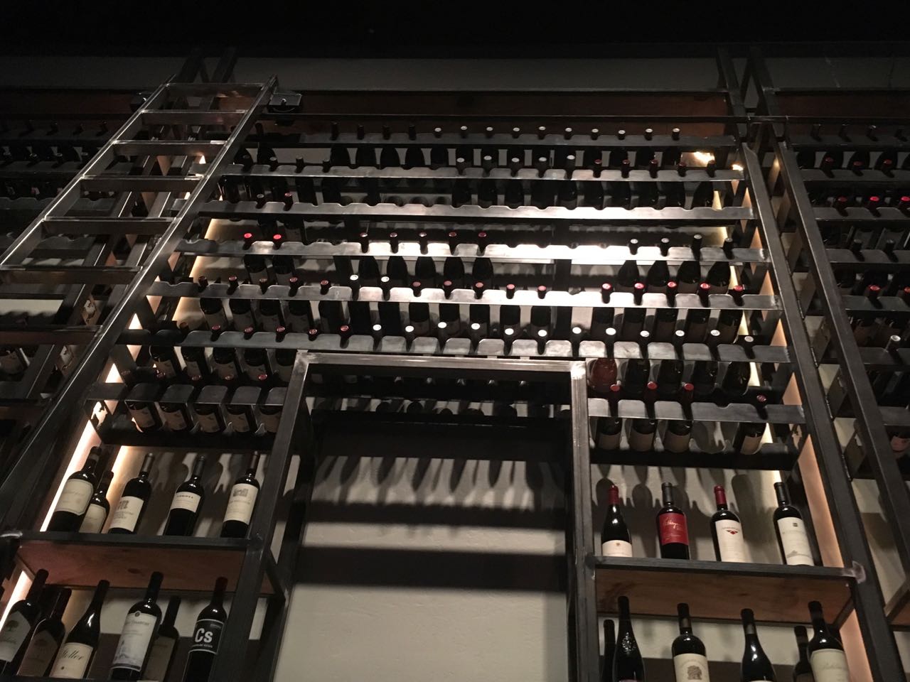 We hung a quick left to the seating area by the DJ. A gorgeous white chandelier hung nearby, and on the other side of our table, stretching up to the ceiling, was a wall of wine.